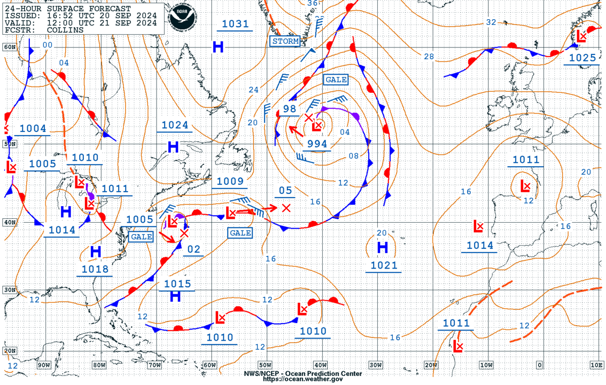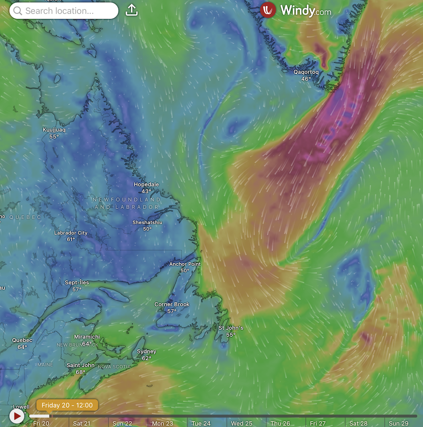 The forecast map for surface conditions in eastern North America and the western North Atlantic highlights the presence of several low pressure systems, including a strong one near Greenland, high pressure (the blue H) in the St Lawrence River valley, and a complex stationary front in the Atlantic. Note the wind barbs, the short blue lines with blue flags (the flags highlight the speed and the direction from which winds are blowing). In this case, see the potential, in terms of winds, to connect Greenland and the Canadian Maritimes and New England.