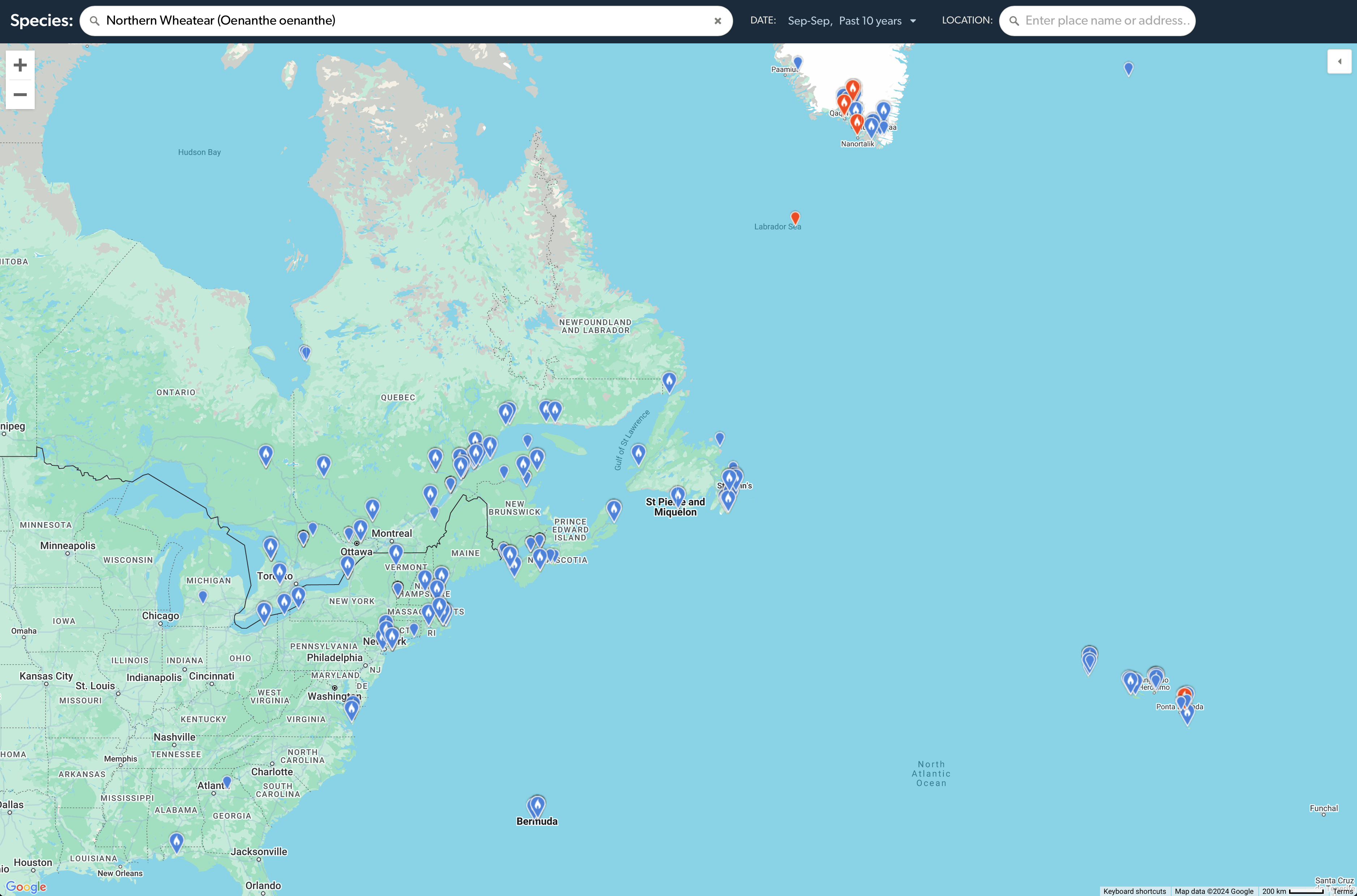 Northern Wheatear occurs annually or almost annually in September (and October) in many areas of eastern North America (the large number of blue balloons on the map). Observations over the last 10 years, including recent observations from points far north and east, in conjunction with prevailing weather patterns (see below), suggest we pose the question: are conditions supportive for this species to occur farther south along the Atlantic seaboard?