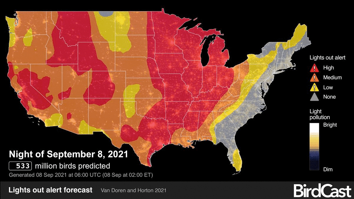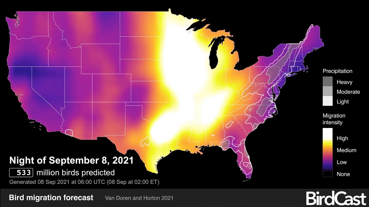The BirdCast team is always excited about migration – it’s in our DNA! But we are especially excited at the prospect of massive nocturnal movements of birds, such as …… the one forecast for this evening! Over the contiguous US the BirdCast model predicts just over half a billion birds to be flying during peak flight hours (~3 hours after local sunset) tonight! Note, the large movements this evening are the largest for the coming days during this pulse of birds moving through the country (you can see this by watching the animation below of upcoming nights’ forecasts): forecast peak nightly numbers gradually diminish after tonight until the next intense pulse of migrants begins to move across the continent on 13 September.