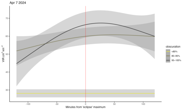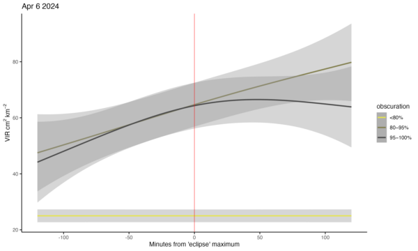 In preparation for the radar data soon to be gathered and analyzed for today, 8 April, we present below the history of two previous days’ worth of biological activity from 143 radars in the contiguous US to set the stage for comparison: 6 April (the top figure) and 7 April (the bottom figure). You’ll notice a measure of biological activity on the y-axis, and time on the x-axis, in this case highlighted by a red, vertical line to represent the time of totality. And importantly, you’ll notice three different color lines representing radars from different areas of the eclipse’s predicted path of obscuration: less than 80% obscuration (67 radars), 80-95% obscuration (44 radars), and 95-100% obscuration (32 radars), corresponding to the visual you see above. The patterns of increasing biological activity as measured by VIR, vertically integrated reflectivity, is quite distinct among these locations in the two hours preceding the time of day representing the eclipse for each of these radars. So, too, the pattern of decline is quite distinct. What patterns will we see today? How will they differ from these patterns? As a starting hypothesis – a null hypothesis if you will – we expect, based on our 2018 paper, that the pattern we will see will be one of a dip – a decline, a drop in numbers – of biological activity at totality; in other words, there will be no difference between the pattern we see this year and that pattern we detected from the 2017 eclipse. Come back later today to check!