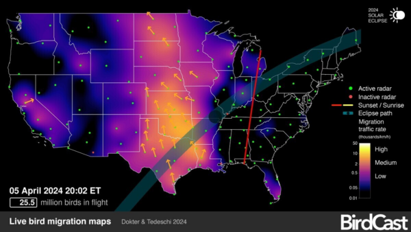 We’re curious to see what will happen this year – early April is a period of active bird migration, which occurs mostly at night as all of your reading this probably know, with birds motivated to arrive as early as possible to their breeding areas; and the timing of this eclipse comes relatively early in the season for large numbers of insects and bats to be active (especially in the northern US given winter-like conditions!), so the observed patterns and behaviors may well be very different from those we saw in 2017.
