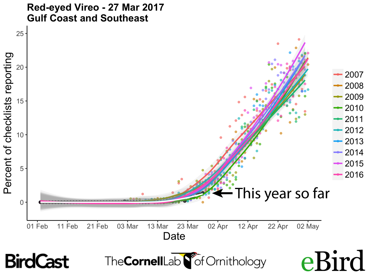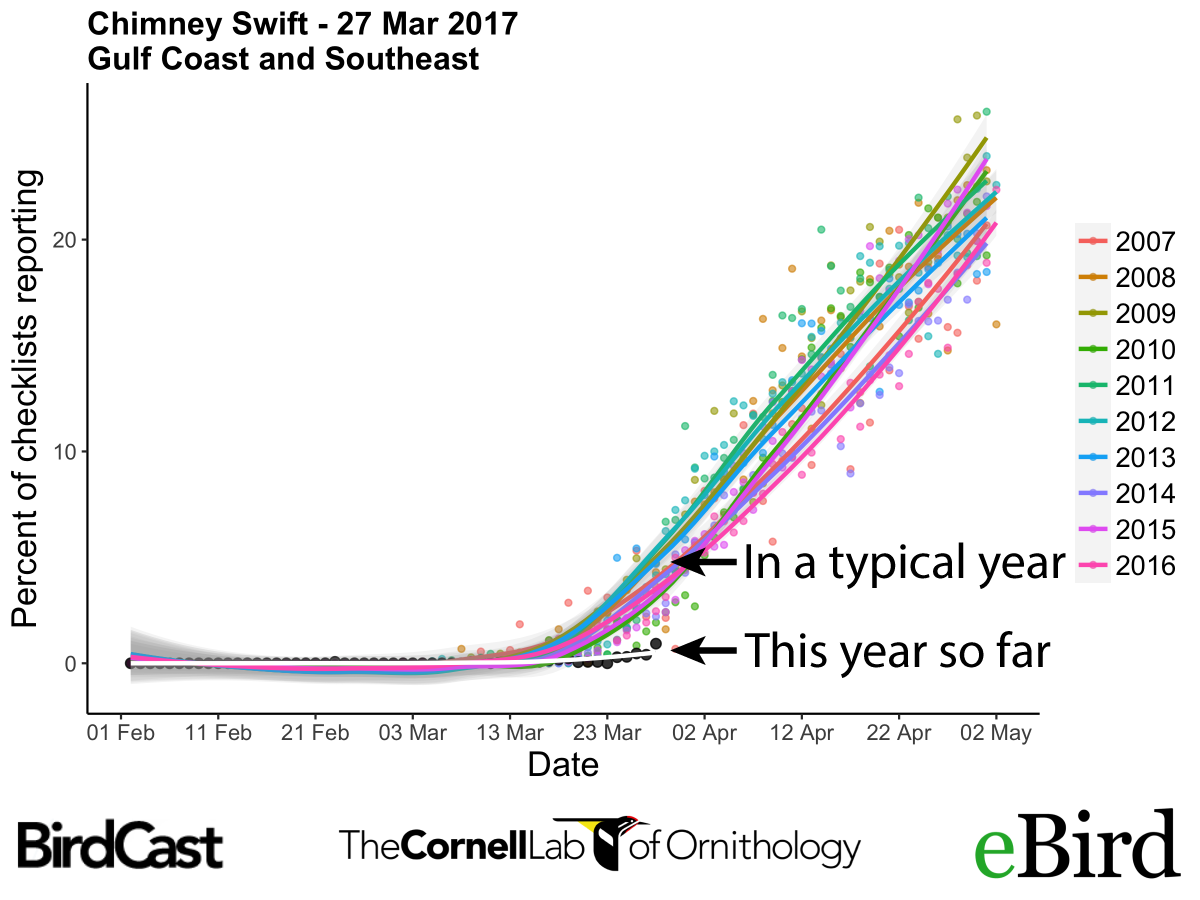 Chimney Swifts are finally beginning to arrive in the US (+404% in last week), but, unlike the Scissor-tails, they are quite late this year, by around 10 days. We’ll keep an eye on this species to see if they catch up rapidly in the next week.
