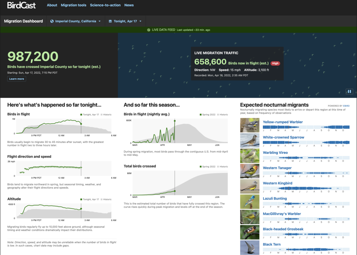 An example of the BirdCast Migration Dashboard showing information for Imperial County, California in the early morning of 18 April 2022.