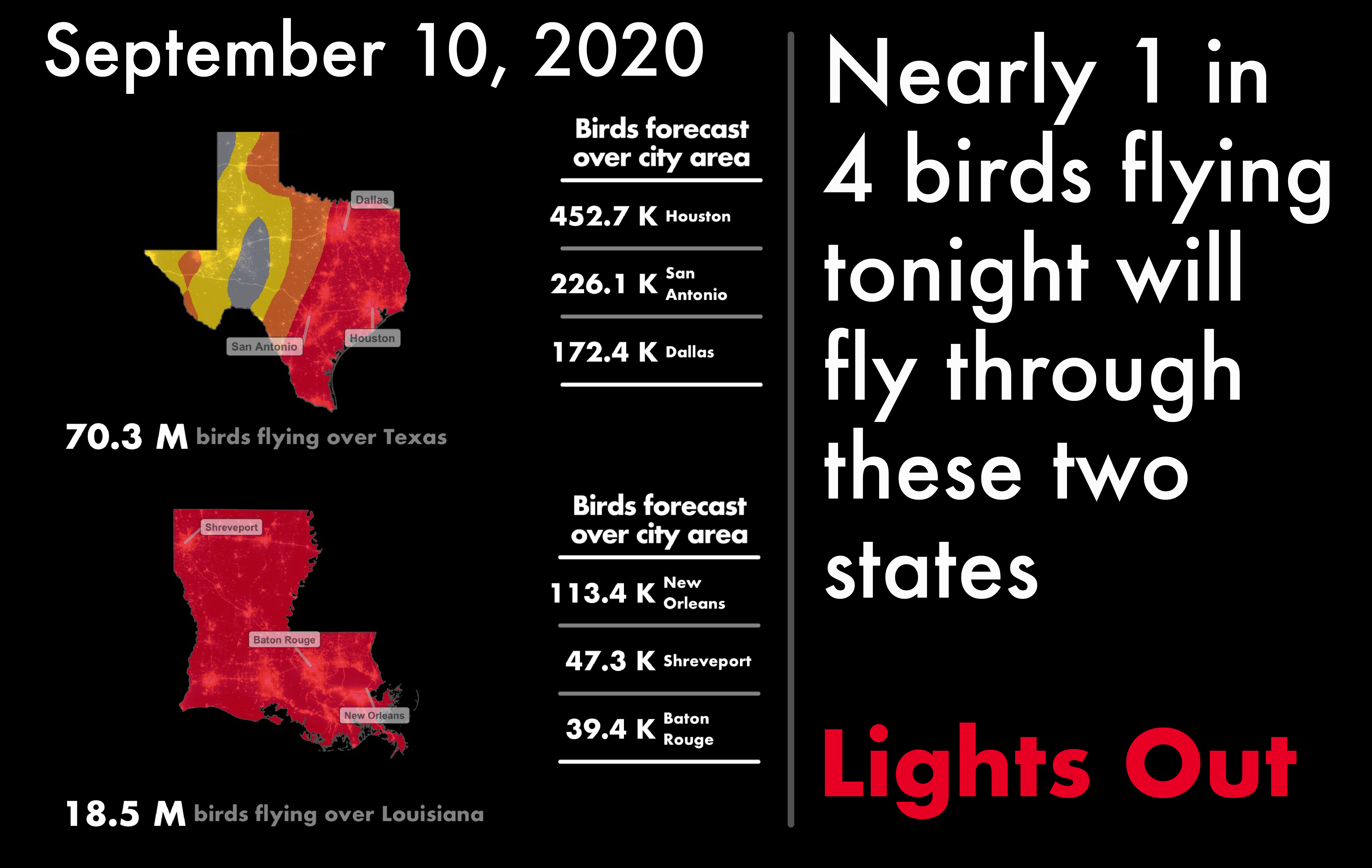 We estimate this migration will comprise approximately 400 million birds, with the highest intensity movements in Texas and portions of the southern Appalachians and lower Mississippi River valley. This will be another amazing opportunity to experience migration, whether by listening at night to vocal birds in flight or observing the following morning for new arrival and departures. These intense movements also highlight an opportunity for conservation action – turn off lights at night to avoid attracting birds into hazardous conditions in which they can collide with buildings and other structures!