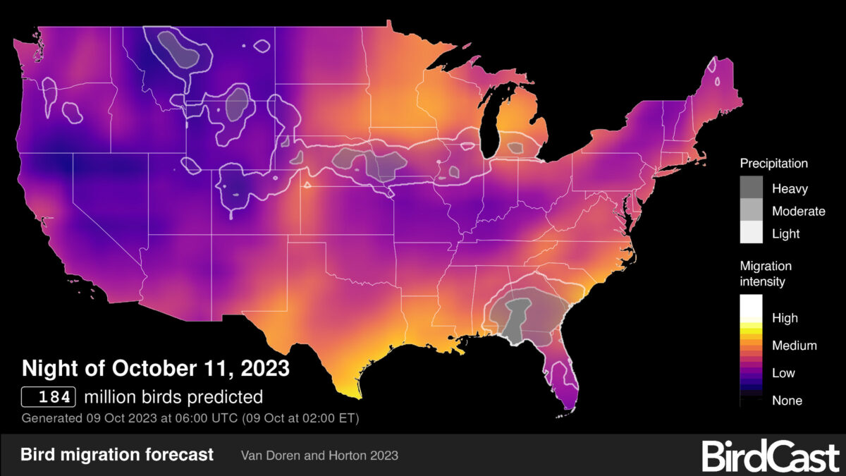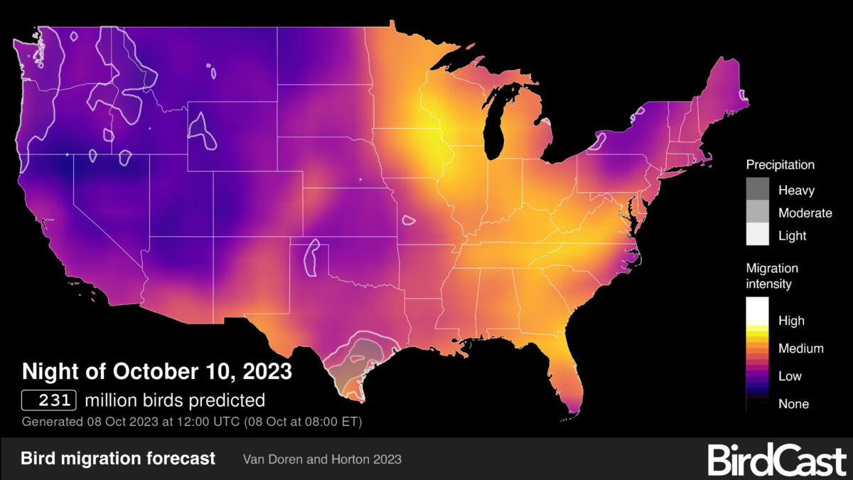 Birds of all kinds were taking to the skies, continuing their remarkable journeys, and captivating novices, experts, and the uninitiated alike across the nation. On the extraordinary night of 6-7 October 2023, we bore witness to an unprecedented event – more than a billion birds taking flight during their nocturnal migration (1.1834 billion at 10:30pm ET). This staggering number is a testament to the enormous magnitude of bird migration at its peak. Such an event, the magnitude of which had never previously recorded in the BirdCast live migration maps, speaks literal volumes about the abundance, resilience and adaptability of these incredible creatures.