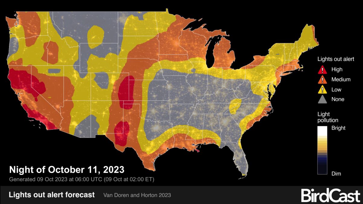 The forecast predicts the highest migration intensity for 9 October 2023 to be, again, in the Midwest; however, by the 11 October 2023, migration intensity generally declines and is more intense only in more southern locations of Louisiana and Texas.