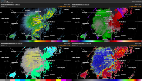 Digging a little deeper into the radar data from the Chicago radar, below is a four panel snapshot from RadarScope showing imagery from pre-dawn. Note that birds and intense precipitation overlap, dramatically, especially apparent in the upper left panel showing reflectivity (other panels also show this, including the velocity, upper right; classification algorithm output, bottom left showing much gray – biology; and lower right, correlation coefficient showing much blue, values indicative of birds, and red, values indicative of precipitation).