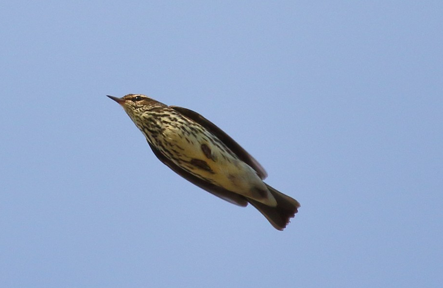 A Northern Waterthrush in flight, one of 35 observed on the morning of 16 May 2020 at Provincetown Airport, from a decidedly odd and unfamiliar perspective for those that have not experience morning flights of nocturnal migrants!