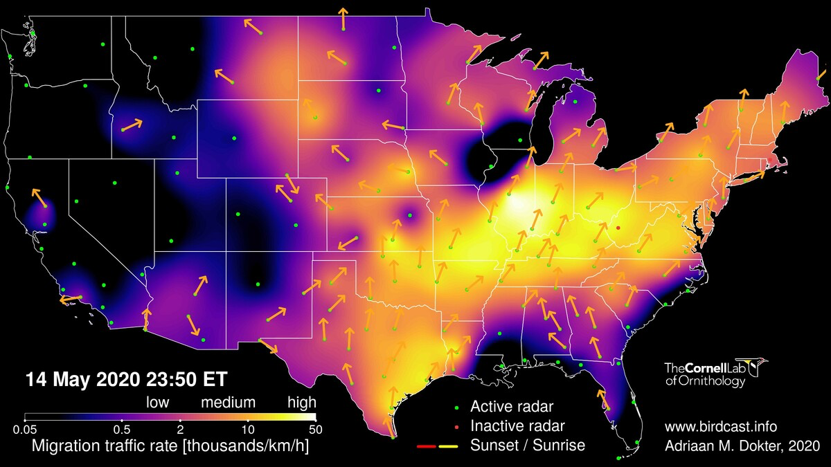 The spring of 2020 has been marked by north winds and wet conditions, which has severely stalled May migration across the Northeastern U.S.—such unfavorable conditions have been especially prevalent since mid April (for example, this brief discussion of the weak polar vortex). Prior to 14 May, the most recent significant movement occurred 2-3 May. Most Neotropical passerines that typically arrive during the second to third weeks of May were delayed by 7-10 days. On the night of 14 May, warm temperatures and southwest winds finally produced a large movement. Throughout the night, birds were moving northeast in coastal New England and the mid-Atlantic states. Local midnight (approximately) saw medium to locally high intensity movements across much of the northeastern US, generally moving to the northeast. By early morning in the hours just before dawn, movements continued primarily in a northeasterly direction along the coast. A new suite of migrants arrived successfully into the northeastern US. This suite of movements was associated with a warm front moving into the region in advance of an approaching frontal boundary farther west.