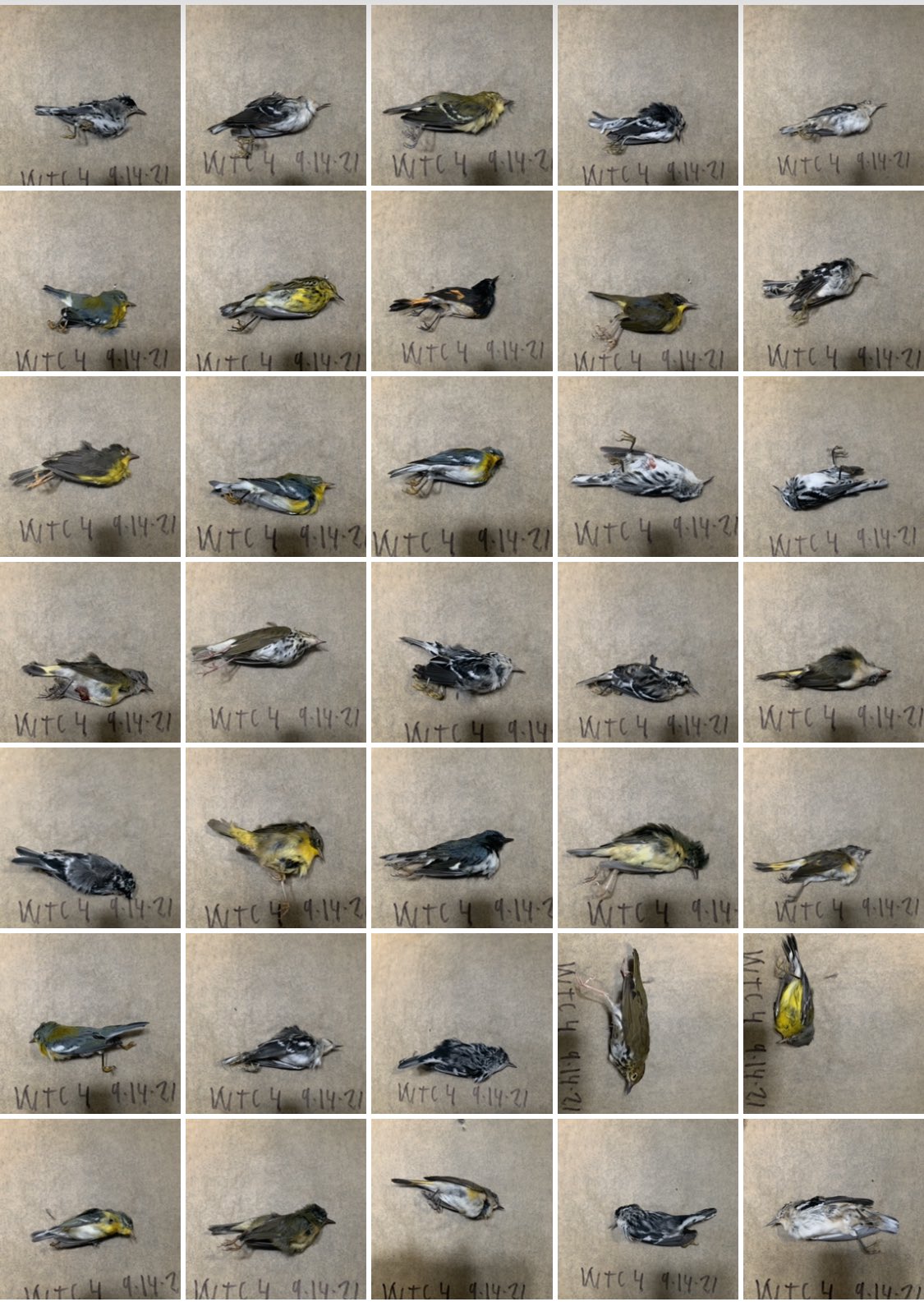 An image of a small number of the birds killed in collisions in New York City on the night of 13-14 September 2021. Photograph taken from a Tweet from Melissa Breyer (click on this image to visit this tweet).