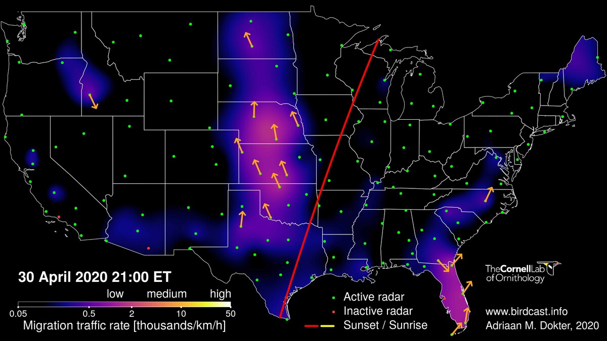 In the early morning hours of 30 April, a strong frontal boundary is moving toward the Atlantic. This front has strong storms with intense precipitation, and in advance of its passage favorable winds for bird migration.