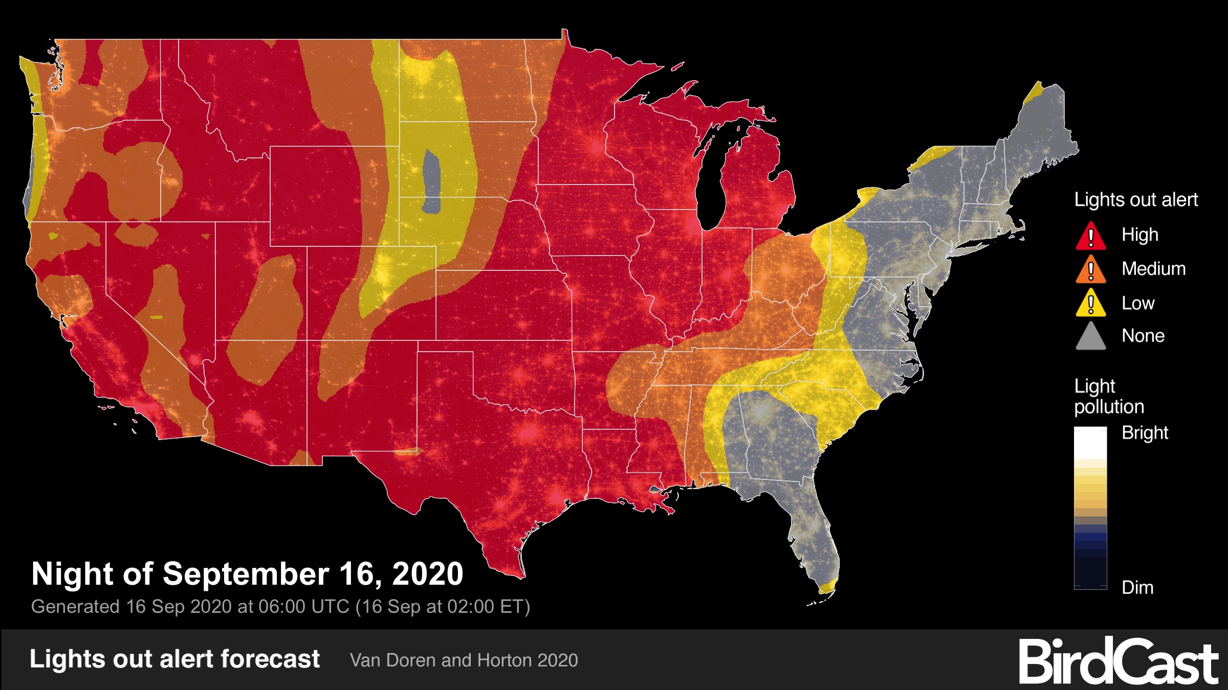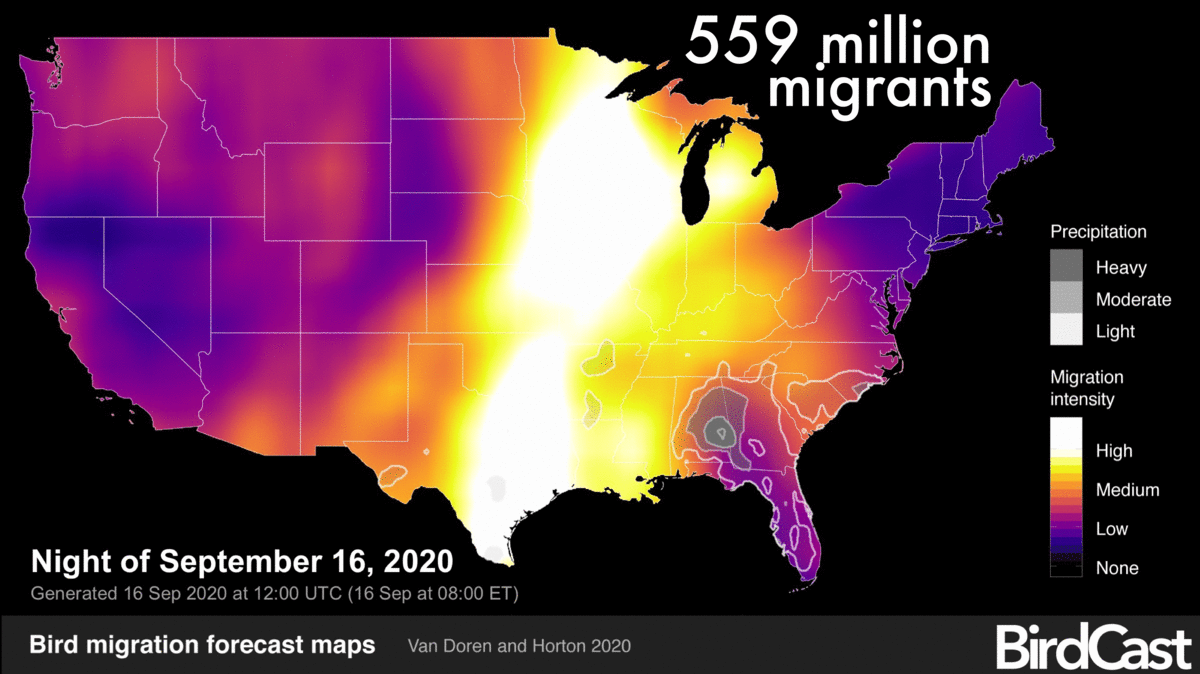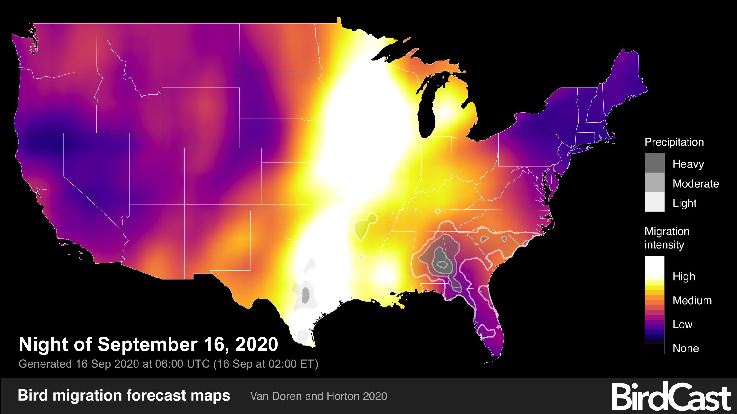 The BirdCast model is predicting high intensity migration for the night of 16 September 2020.
