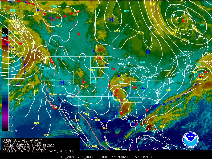 Second, weather conditions during the 23-25 April 2020 window were dynamic and at times intense. The image below shows a frontal boundary associated with the passage of low pressure (the red L) east of Nova Scotia as well as precipitation distributed offshore (see the red, orange, and yellow colors from peninsular Florida north and east to the low pressure center). This front moved slowly off the coast over the 36 hours preceding this image, creating similar conditions during that period. With southerly winds (from the south) ahead of the advancing front, birds moving downwind would travel offshore; when encountering weather, birds would fly at low altitudes and attempt to find any available location to land, including ships, oil rigs, or the nearest land mass.