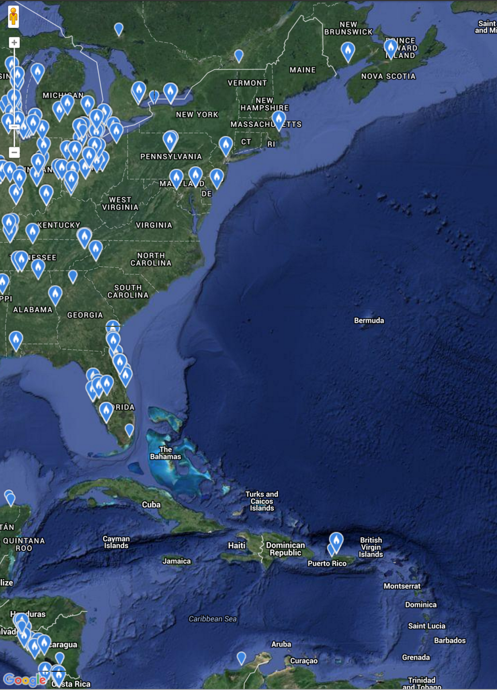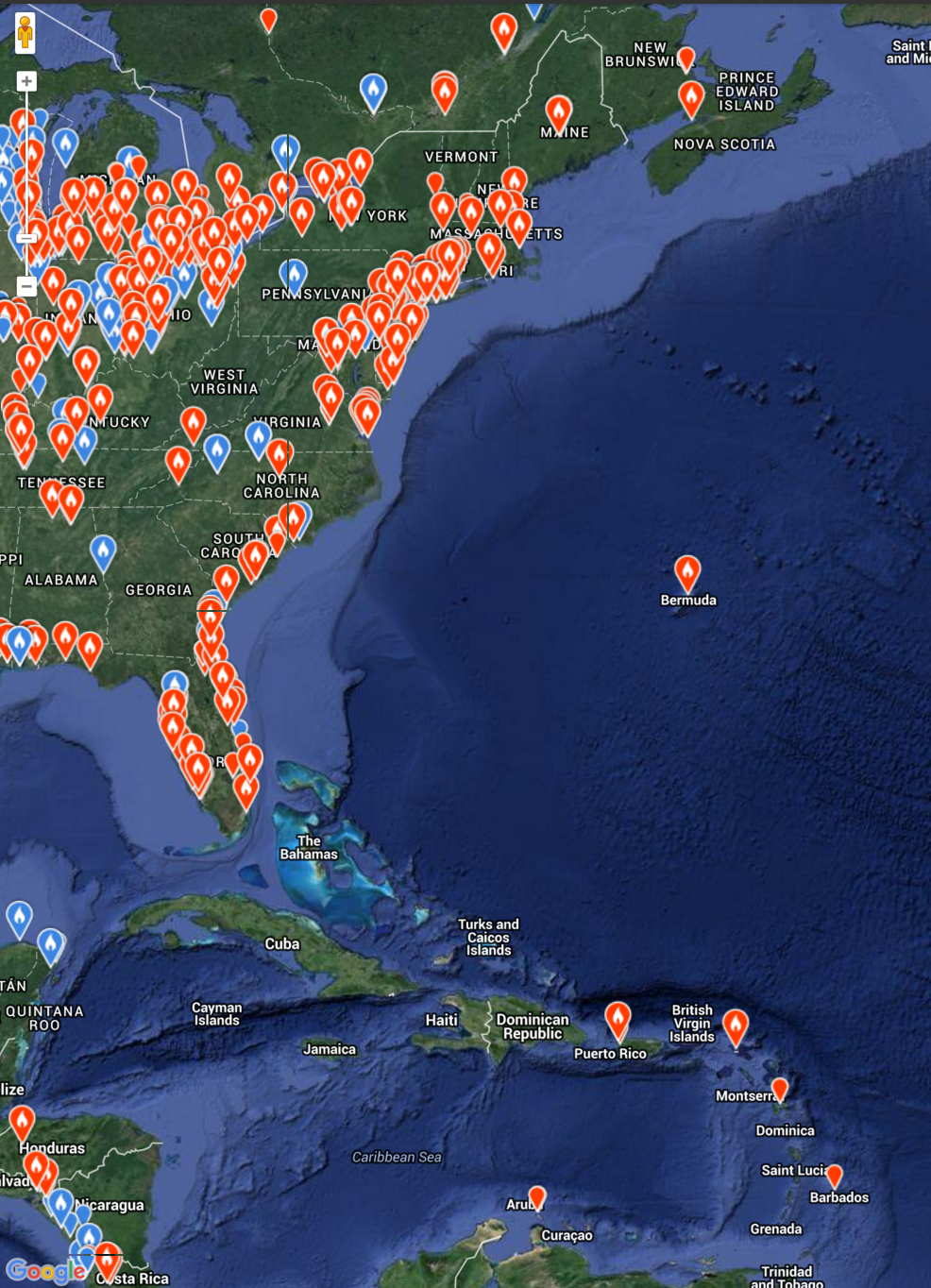 Next, compare the 2014 Franklin’s Gull map (upper; typical of most years, with just a small handful of records on the East Coast (mostly in Florida) with the map from 2015 (lower map; November-December records in red). Not shown on the 2015 map is an Iceland record and a couple recent Caribbean records as the birds from the invasion have worked their way south (most Florida records from 2015 appear to be birds filtering south along the coast). Note the strong Great Lakes and East Coast prevalence in the 2015 invasion. There surely would have been more inland records if observers had mobilized faster on the day of the invasion–13 November–and if the invasion had happened on a weekend instead of a weekday.