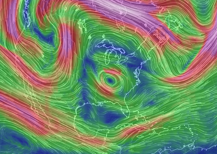 For the past few days there has been an upper level low pressure system spinning about over the Ohio and Tennessee River Valleys (see the image below). This feature is cut off from the main polar jet stream current, which is flowing across Canada.