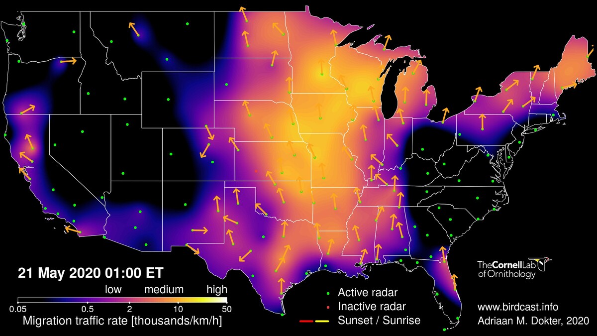 The effect of this is rain south of the northeast U.S from Ohio to the Carolinas. For the past few mornings, radars in the northeast U.S have seen modest bird echoes at night. But, to the south across the mid Atlantic and Ohio Valley, there has been little migration as detected by radar. The figure below depicts an example of this pattern, this mosaic from the night of 20-21 May 2020.