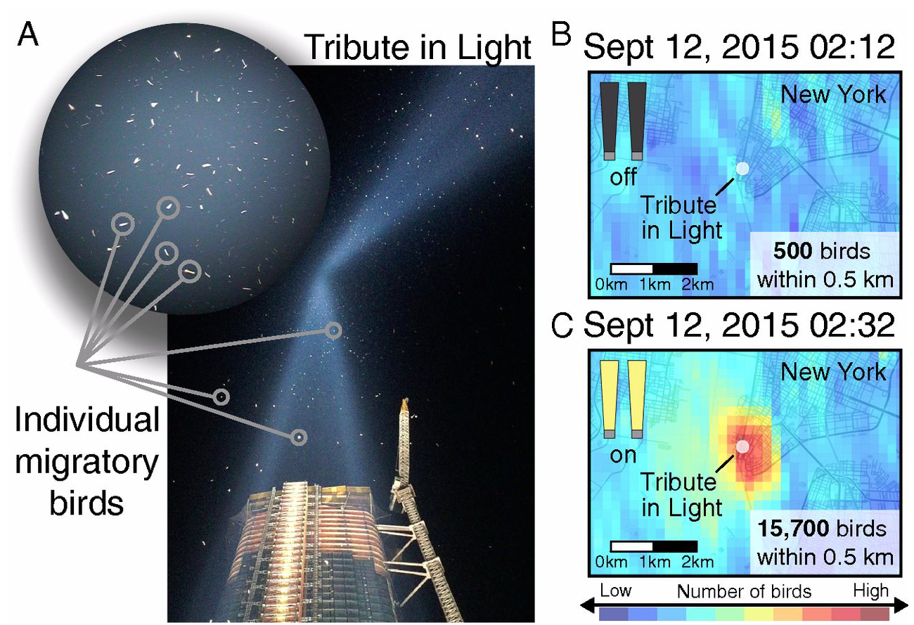 In the graphic below published in 2017, the left panel (A) highlights the individual birds often visible during an evening of monitoring at the Tribute in Light, whereas the right panels (B and C) highlight the change in bird density we can see on radar between lights off (B) and lights on (C).