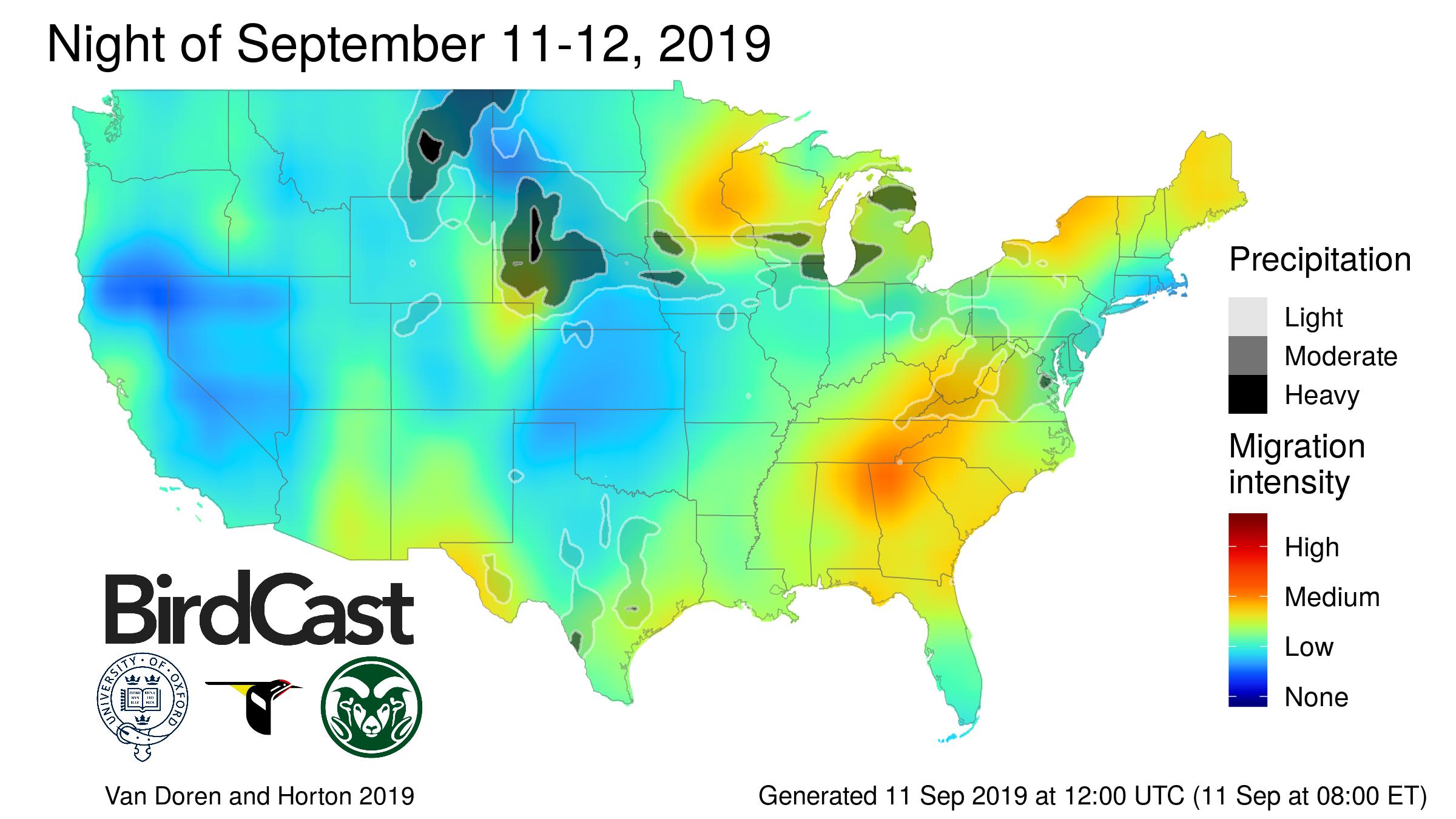 In 2019 we expect that bird migration in the region in the first few hours after sunset on 11 September will be low intensity, with largely unfavorable warm conditions and southerly winds keeping most birds on the ground. Although we expect some numbers of birds during this period to be attracted and disoriented by the intense lights, BirdCast is not forecasting the intensities seen previously, for example, in 2010, 2015, and 2016.