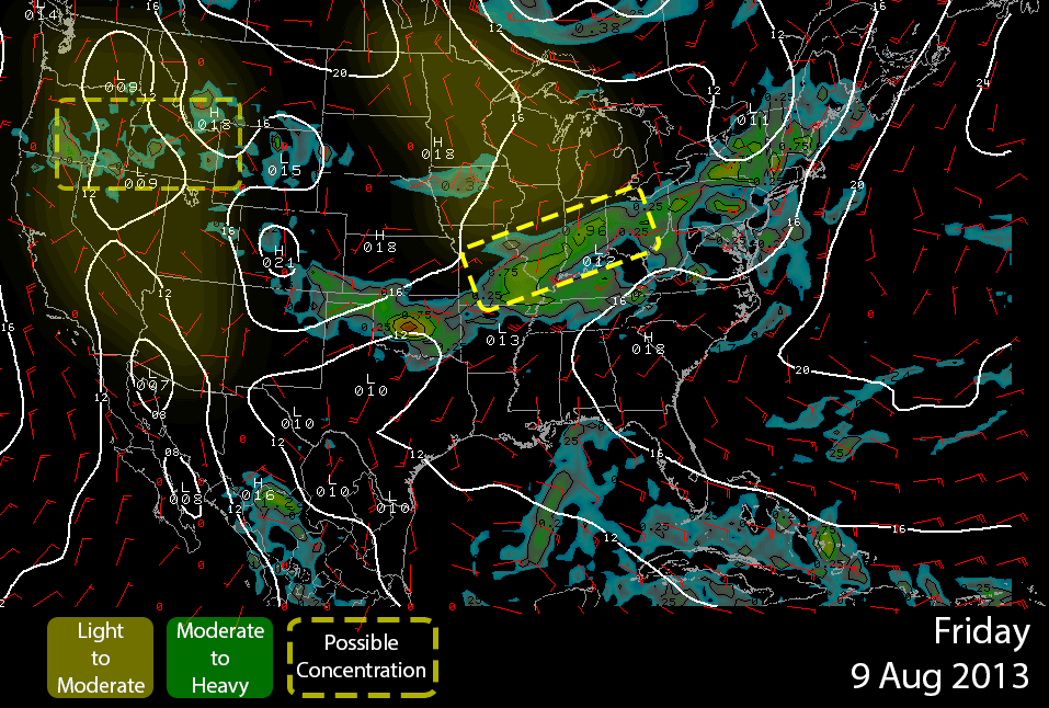 August 9, 2013Regional Migration Forecast: 9-16 August 2013Scattered light and locally moderate movements will occur across the West, while two primarily northeastern pulses of light to moderate and locally heavy movements occur among storm systems in the East.