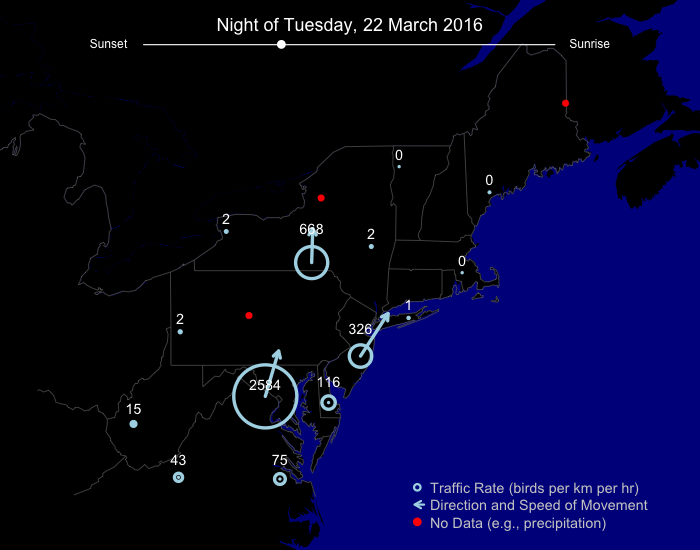 April 9, 2016Traffic Report, Northeastern US – March and early April 2016Welcome to our first spring 2016 installment of the traffic report describing northeast US nocturnal bird migration traffic rates, as calculated from a completely automated pipeline of algorithms. The images you see in Traffic Reports present the migration traffic rate (MTR), direction…