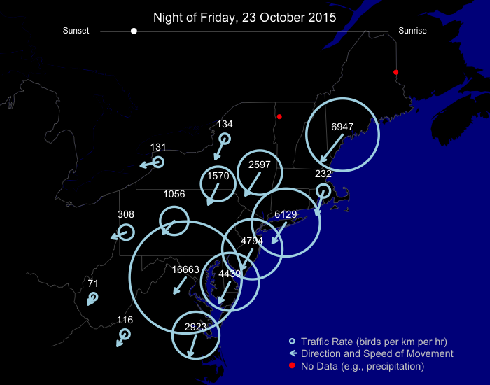 October 30, 2015Traffic Report: Northeastern US, 23-29 OctoberMigration events over the last week varied substantially in size. Last Friday night (23 October) saw a particularly large movement (see below to watch), followed by no (or extremely small) movements on the following night. Successive nights saw decreasing migration traffic rates; remember, a major low pressure system moved through the region with lots of precipitation.