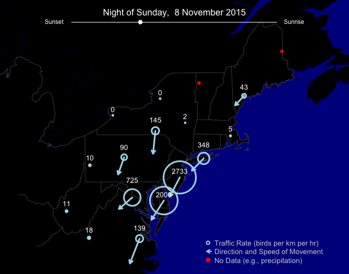 November 14, 2015Traffic Report: Northeastern US, 6-13 NovemberWelcome to our latest installment of the traffic report describing northeast US nocturnal bird migration traffic rates, as calculated from a completely automated pipeline of algorithms. The images you see in Traffic Reports present the migration traffic rate (MTR), direction of…