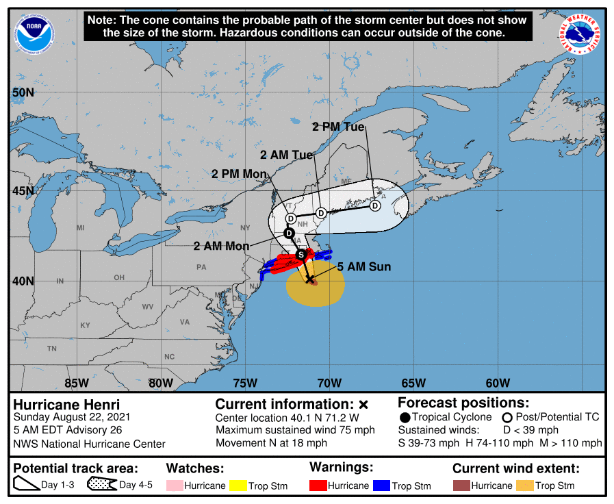 August 21, 2021The arrival of Henri in the Northeast USOn Sunday Tropical Storm/Hurricane Henri will make landfall in southern New England with dangerous storm surges, strong winds, and heavy rainfall. The storm is then slated to move north up the Connecticut River valley before departing east into the Gulf of Maine. This system will bring numerous seabirds ashore, in many coastal and inland waterbodies in and east of its path.