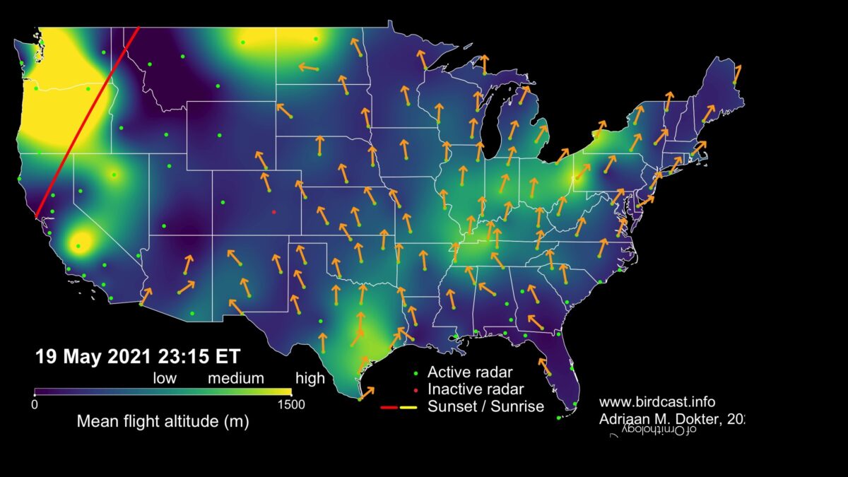 May 22, 2021Migration analysis: flight altitudes of nocturnally migrating birds in late MayDuring the past week, enormous numbers of birds have been migrating through the US. A review of our live migration maps, in particular the night of 14-15 May, confirm several nights well above 400 million birds aloft!