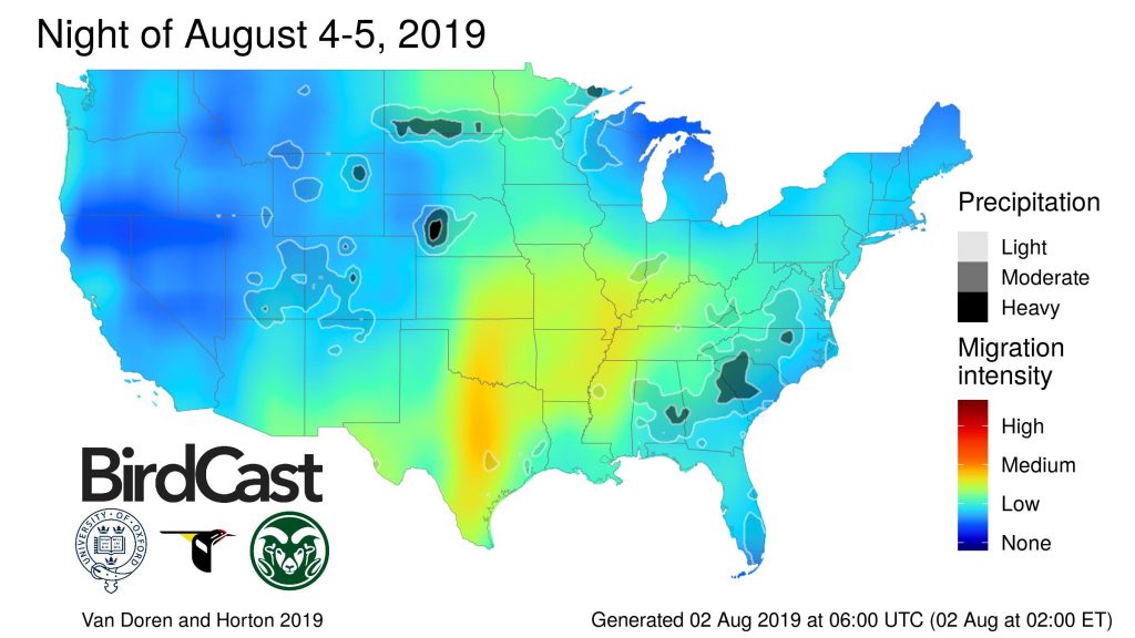 August 28, 2019BirdCast’s Fall 2019 Campaign BeginsWelcome to fall migration season 2019 for BirdCast! Our 3-day forecast maps have returned, and our migration maps are live, so you can check predictions for and monitor nightly migration intensity through the fall season. Please visit us often!