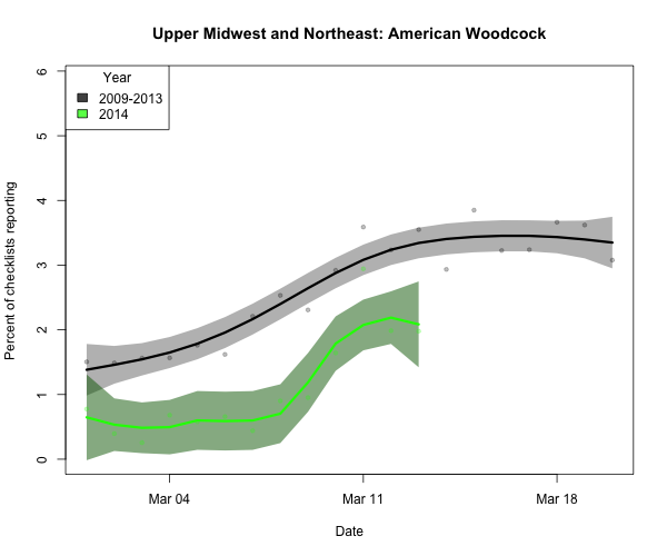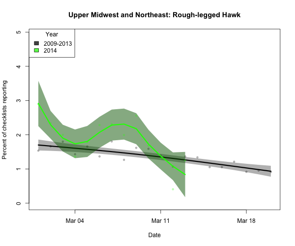 Local light movements were apparent for the weekend in the region, growing on Monday night into light to moderate movements from the central Mississippi River valley east to DelMarVa. As low pressure and precipitation moved into the region, light to moderate, and even locally heavy movements occurred ahead of its passage from the Ohio River valley east and north into New York. The passing of this system, and all of its rain and snow, shut down movements across the board, with a return of local light to moderate movements in the Mississippi River valley by Thursday night. Species on the move this week included Canada and Snow Geese, Tundra Swan, Wood Duck, Green-winged Teal, Northern Pintail, Ring-necked Duck, Double-crested Cormorant, Turkey Vulture, Osprey, Rough-legged Hawk, Sandhill Crane, Killdeer, American Woodcock, Yellow-bellied Sapsucker, Tree Swallow, Hermit Thrush, Yellow-rumped Warbler, Red-winged Blackbird, Common Grackle.
