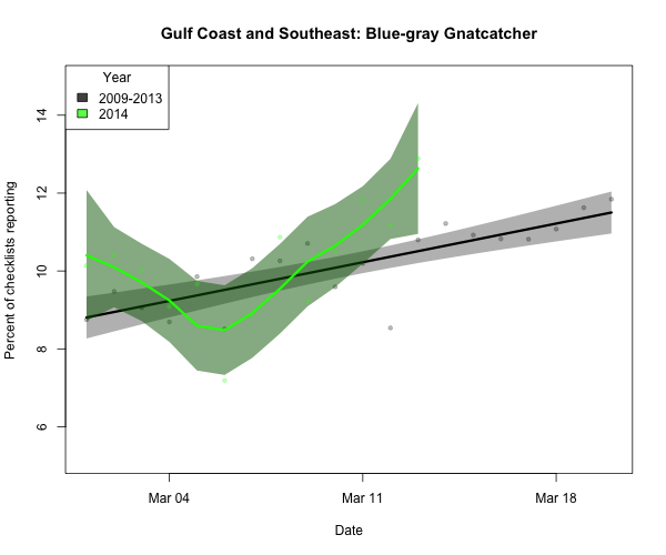 Localized light to moderate movements kicked off the weekend along the Sabine River and east of the Ozarks. Scattered light to moderate movements gradually shifted east over the weekend tracking marginal and slightly favorable conditions through the region to the Florida Peninsula by Sunday night. The week began with widespread light and locally moderate movements across the region, and built into locally heavy movements on Tuesday night. These included a heavy flight of migrants from Cuba and heavy movements along the Atlantic Coast of the Southeast. Low pressure tracking east shut down movements in its wake across the region, with some return of light to locally moderate movements west of the Mississippi River to end the period. Species on the move this week included White-eyed Vireo, Barn and Northern Rough-winged Swallows, Blue-gray Gnatcatcher, American Pipit, Northern Parula, Black-and-white and Yellow-throated Warblers, Savannah, Fox, White-crowned, and White-throated Sparrows, Dark-eyed Junco, and Purple Finch.