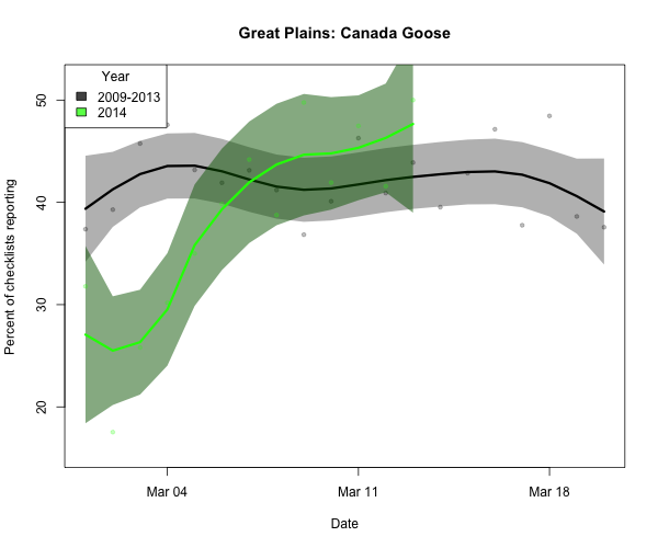 A quiet weekend and early week saw locally scattered light movements, expanding in extent and magnitude on Sunday and Monday nights primarily in the central and southern Plains. The remainder of the period saw one more extensive pulse of movements, primarily in the central and southern Plains where light to moderate movements occurred on Thursday night. Species on the move this week included Canada Goose, Gadwall, Ring-necked Duck, Hooded Merganser, Horned Grebe, Double-crested Cormorant, Sandhill Crane, Killdeer, American Woodcock, Eastern Phoebe, Purple Martin, Eastern and Western Meadowlarks, Common Grackle, McCown’s Longspur, and Dark-eyed Junco.