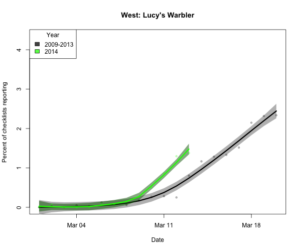 Widely scattered light to locally moderate movements occurred in the West, while the East experienced widespread light to moderate and locally heavy movements early in the week. Species on the move this week included Canada Goose, Gadwall, Ring-necked Duck, Hooded Merganser, Double-crested Cormorant, Sandhill Crane, Killdeer, American Woodcock, Eastern Phoebe, Black-and-white and Lucy’s Warblers, Red-winged Blackbird, Common Grackle, Song and White-throated Sparrows, and Dark-eyed Junco..