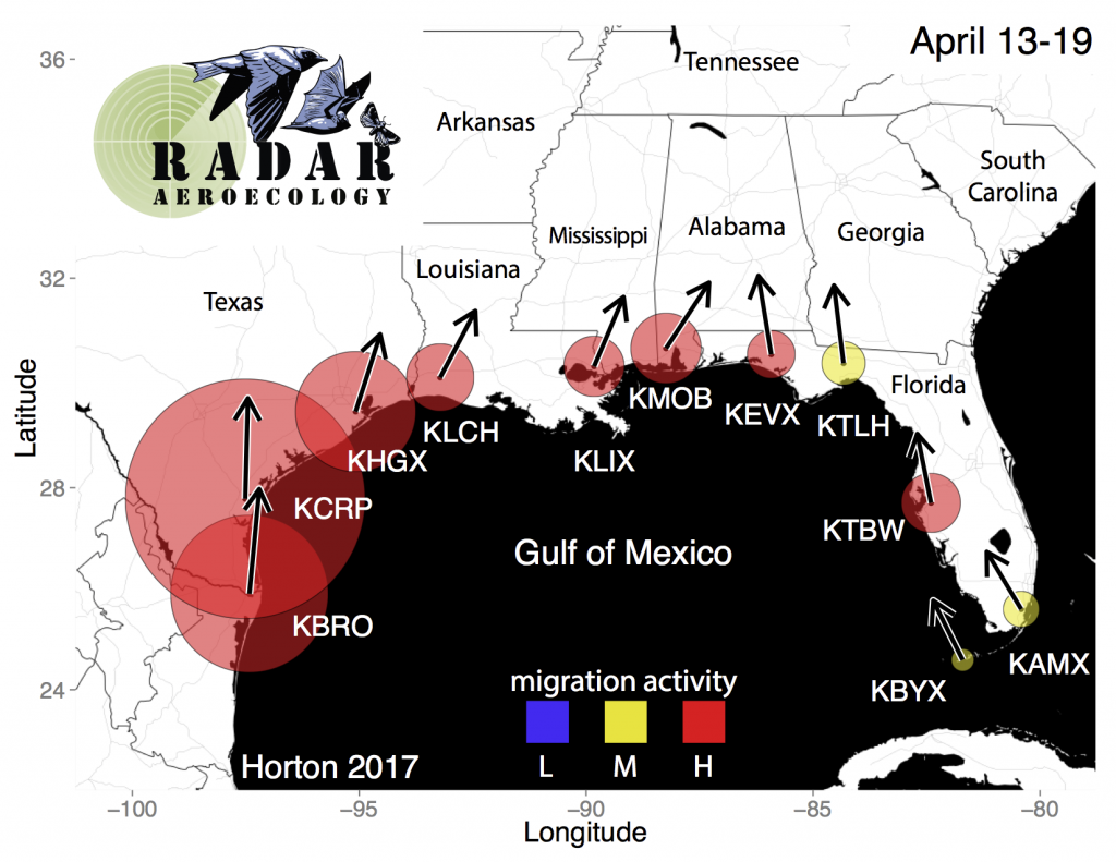 Finally, and new for Spring 2017, our friend Kyle Horton of the Radar Aeroecology Lab at Oklahoma University created a new set of images depicting spring bird movements in the Gulf of Mexico region as part of an analysis that he is leading as part of our ongoing collaboration. This feature appears in the Gulf Coast and Southeast region forecast.
