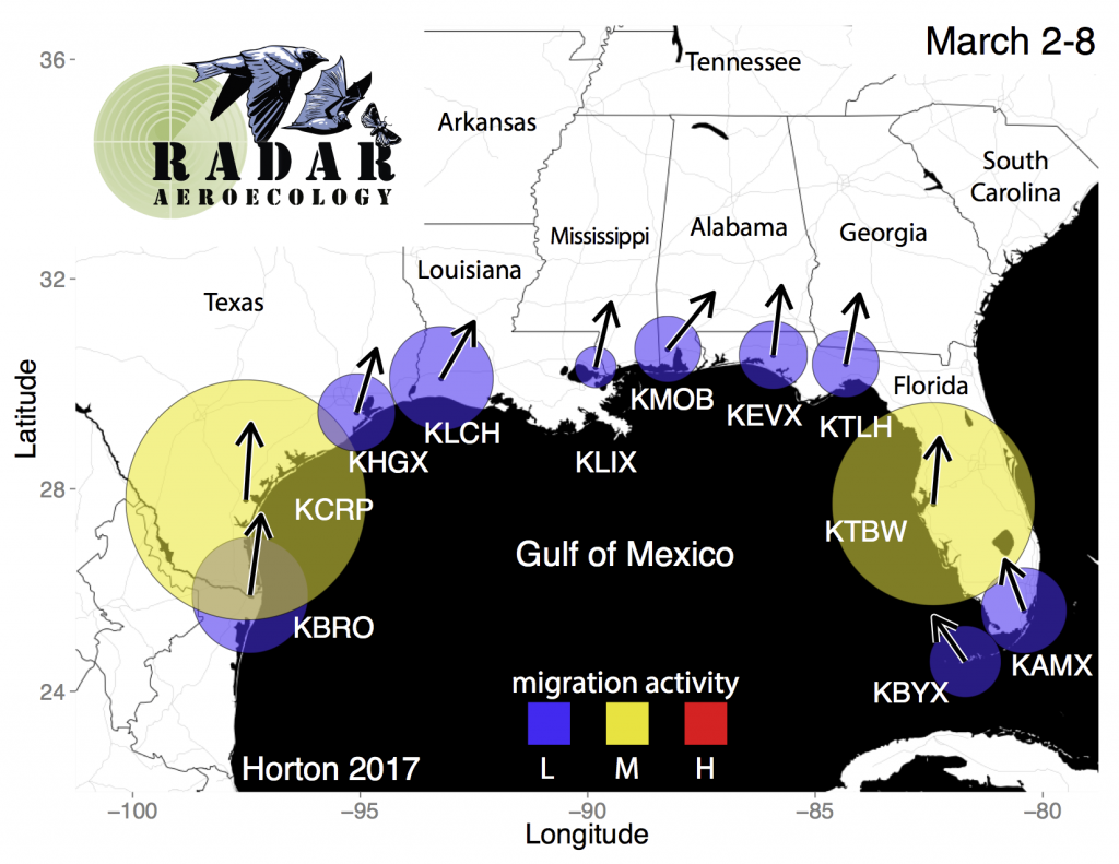 Finally, and new for Spring 2017, our friend Kyle Horton of the Radar Aeroecology Lab at Oklahoma University created a new set of images depicting spring bird movements in the Gulf of Mexico region as part of an analysis that he is leading as part of our ongoing collaboration. This feature appears in the Gulf Coast and Southeast region forecast.