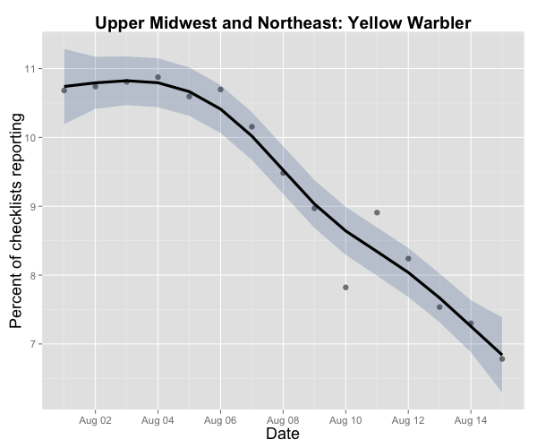 At the same time, Yellow Warblers — generally quite early migrants — are already past their peak! Where are they going? See below… eBird data from 2004-2013.