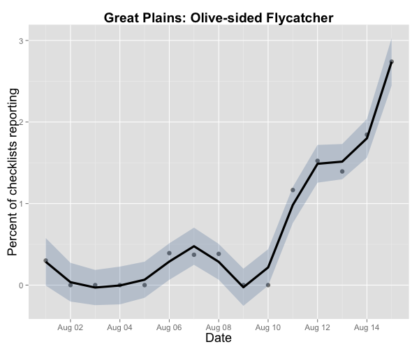 Olive-sided Flycatchers are poised to begin moving south in the Plains region as well as in most other parts of the country. eBird data from 2004-2013.