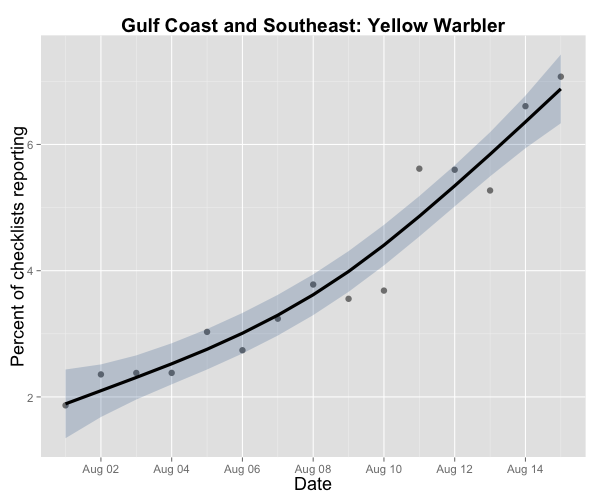Well, all the Yellow Warblers leaving the north have to go somewhere — and they’ll be showing up in the Southeast soon, en route to neotropical wintering grounds. eBird data from 2004-2013.