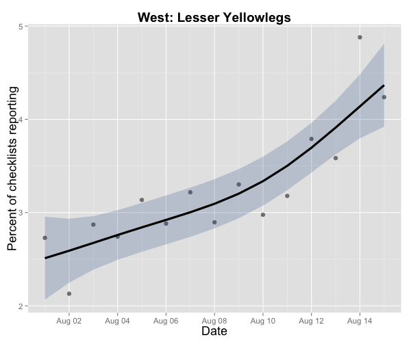 Shorebird migration is in full swing across the country, shown here with Lesser Yellowlegs using eBird data from 2004-2013.