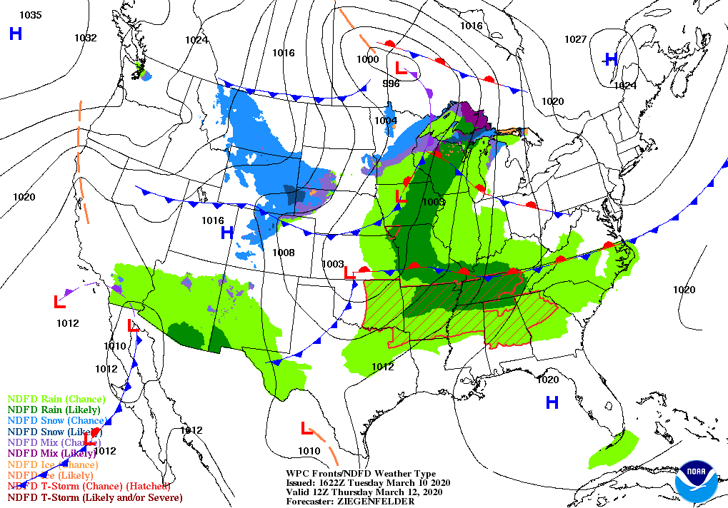 Spring migration is well underway for a number of species, and the tables below highlight species you can expect in your regions over the coming week! Note that, as our 1-, 2-, and 3- day forecasts highlight, the most noticeable movements will occur in the southern and southeastern US ahead of an approaching weather system crossing the country’s mid-section (areas forecast to receive precipitation of various types appear in greens and blues in the image below).