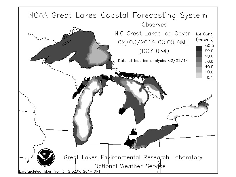 There are presumably several possible causes for these patterns, a couple of which we posited last week. An intriguing correlation, and one that presumably has much bearing on these patterns, is the percentage of ice cover on the Great Lakes. Jeff Masters posted an excellent account (and several of our friends have highlighted this, thank you!) of how drastic is this year’s cover relative to the coverage in the last 20 years. A quick look at the present day’s coverage continues to support what that blog post suggested: there is extensive ice cover on the Great Lakes: