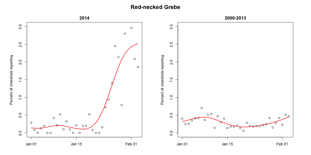 Late last week Teams BirdCast and eBird posted a story about some recent winter movements. Here, we decided to look a bit more closely at what seemed to be some rather drastic departures this winter in the patterns of distributions of two species: White-winged Scoter and Red-necked Grebe. We focused our efforts on eBird data submitted for the month of January in the 2000-2014 period from New York, New Jersey, Pennsylvania, Maryland, and Delaware. The data show some intriguing patterns. The figures below were created by BirdCaster Benjamin Van Doren, showing daily changes in the percentage of complete checklists in the given region that report White-winged Scoter and Red-necked Grebe. The right graph plots the January 2000-2013 daily patterns of changes in percentage of complete checklists reporting the species as well as a smoothed trend line, and the left graph plots the January 2014 pattern. Notice that, for both species, the 2014 data show striking differences in the numbers of checklists in this region reporting these two species in the last 10 days of January and into early February.