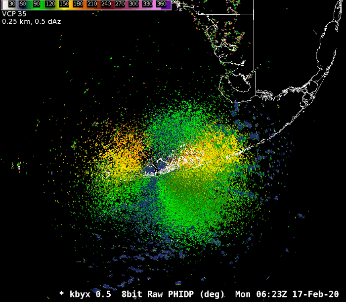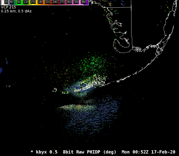 NWS Key West reported on bird migration captured by the KBYX radar on 17 February 2020. This frame captures the departures of birds from Key West, noticeable in the green and yellow patterns to the northeast of Key West. In the animation posted to Twitter, you can see the patterns’ movements to the north.