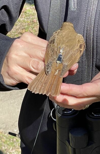 A Hermit Thrush with a Cellular Tracking Technologies Hybrid LifeTag transmitter about to released at the Warner Park Nature Center Bird Banding Station. These radio-tags transmit on 434 HGz frequency and are solar powered with a rechargeable battery that allows them to transmit 24 hours a day.