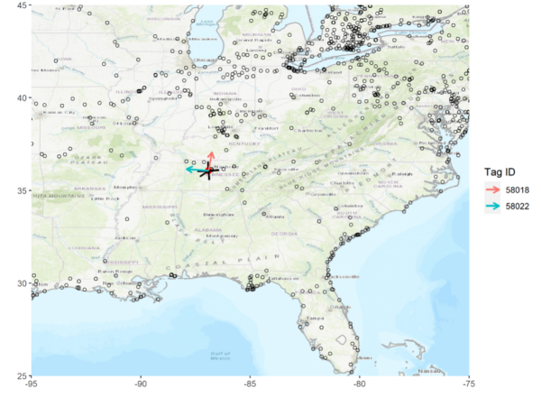 Hermit Thrushes winter in Middle Tennessee and in fall 2020 we radio-tagged two with Cellular Tracking Technologies (CTT) LifeTag radio transmitters, which we monitored with our receiver stations. To our delight both birds spent the winter with us, departing on 16 February 2021 and 07 April 2021. In fall 2021, we radio-tagged three Hermit Thrushes with CTT Hybrid LifeTags.