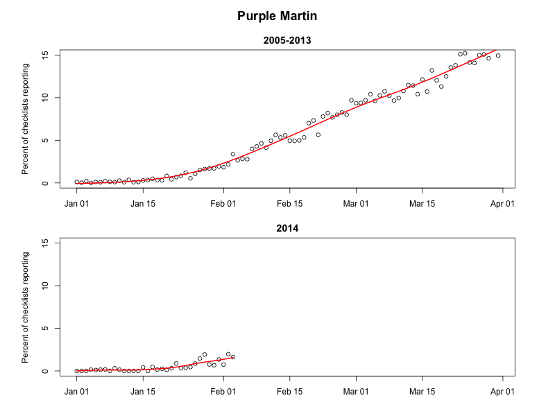 So, there are plenty of exciting patterns to consider, and the winter is still young (insert teeth chattering here). But all is not lost for those yearning for the pulses of spring migrants, and signs are appearing on the horizon, so to speak. Purple Martin numbers are slowly increasing through the end of this month and the beginning of February. Those in the Southeast, although still recovering from snow, ice, and much cooler than normal weather, should watch for more martins to appear in the coming weeks (certainly something to take one’s mind off the weather, or focus on some aspect of weather other than the buzz-worthy polar vortex wobbles).